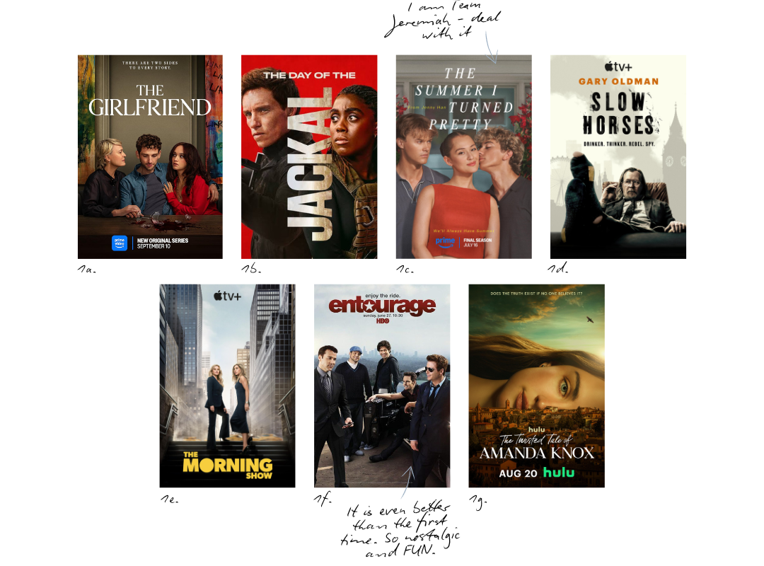 1a. The Girlfriend | 1b. The Day of The Jackal | 1c. The Summer I Turned Pretty (I am team Jeremiah. Deal with it.) | 1d. Slow Horses | 1e. The Morning Show | 1f. Entourage (It is even better than the first time. So nostalgic and reminds me when we were fun.)