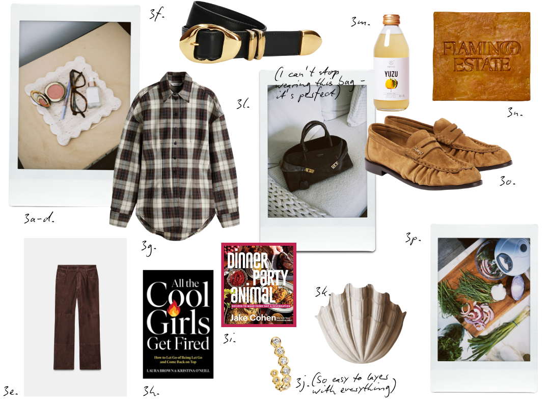 3a. Westman Atelier Super Loaded Tinted Highlighter in Peau de Soleil (the legendary Gucci Westman sent me this product years ago, and I still use it every day) | 3b. Kosas Soulglazer Intensifying Waterproof Gel Eyeliner in Allure | 3c. KHAITE x Oliver Peoples 1978RX Glasses (twinning with my favorite person in the universe) | 3d. Natasha Denona Hy-Gen Bronze Serum | 3e. ZW Collection Limited Edition 100% Suede Pants (so good) | 3f. The Grumeti Amanu Belt in Black | 3g. H+M Defined-Waist Twill Shirt in Brown/Plaid 3h. All The Cool Girls Get Fired by Laura Brown and Kristina O’Neill | 3i. Dinner Party Animal by Jake Cohen | 3j. Kimai Semi Hoop Earring (So easy to layer with everything) | 3k. Plaster Shell Uplighter by Rose Uniacke | 3l. Ferragamo Hug handbag (L) in Testa di moro (I can’t stop wearing this bag - it’s perfect) | 3m. Sparkling Yuzu Juice (discovered this at Yume Sushi and now a staple in our home) | 3n. Flamingo Estate Golden Girls Brick Soap (genius as usual) | 3o. Saint Laurent Le Loafer Supple in suede Cognac | 3p. Ourokhome Manual Food Processor Vegetable Chopper (I buy everything Sivan's Kitchen tells us to)