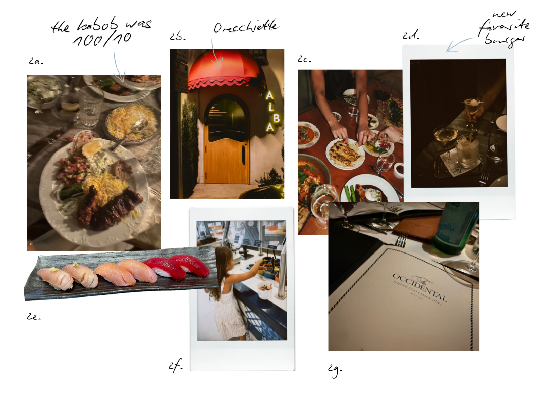 2a. Berenjak - Los Angeles (the kabob was 100/10)| 2b. Alba - Los Angeles (Orecchiette) | 2c. Carmel - Los Angeles | 2d. The Benjamin - Los Angeles (new favorite burger) | 2e. Yume - Los Angeles (garlic albacore roll) | 2f. Go Greek - Los Angeles | 2g. The Occidental - Washington D.C. | 2h. Cafe Milano - Washington D.C | 2i. Le Diplomate - Washington D.C.